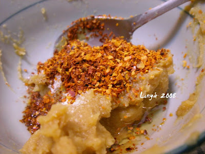 加入些許麻油和味碄,為了怕不夠辣,再補上一些朝天辣椒粉