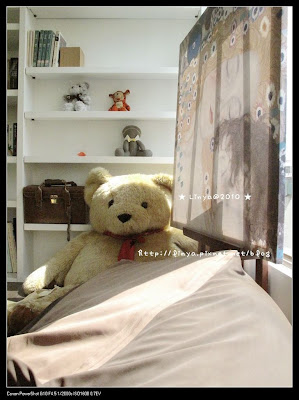 除了整面書櫃外,還有懶骨頭、小熊,和畫作,以及太陽。